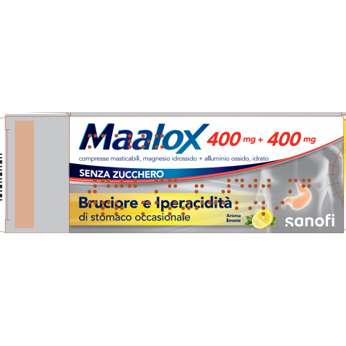 In saldo! -6,33% Quick view Maalox 400 mg + 400 mgi Senza Zucchero 30 Compresse Masticabil Prezzo regolare 13,90 € -6,33% Prezzo 13,02 € Acquista